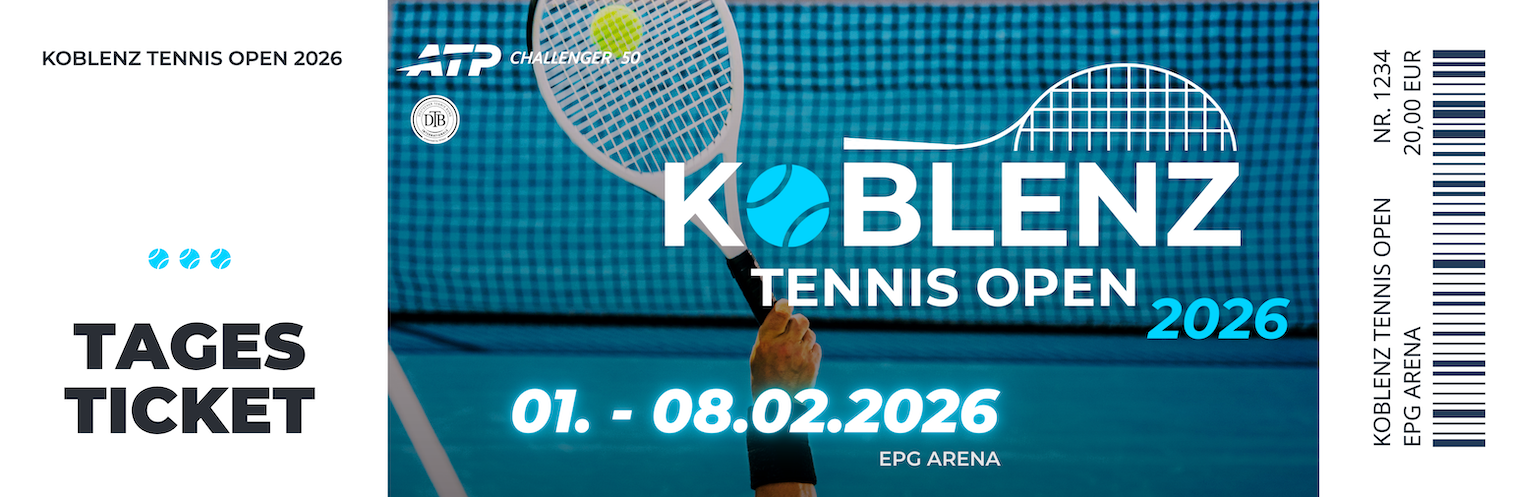 Ein ganzer Tag Spitzentennis. Erleben Sie die Koblenz Tennis Open live: hochklassige Matches, internationale Spieler und die besondere Turnieratmosphäre in der EPG Arena – an einem Tag Ihrer Wahl.