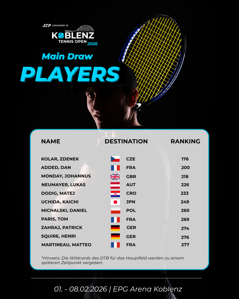 Die Koblenz Tennis Open 2026 präsentieren ein starkes Teilnehmerfeld, das Tennisfans aus der Region und darüber hinaus eine spannende und sportlich hochwertige Turnierwoche verspricht. Vom 01. bis 08. Februar 2026 treten Spieler mit internationalen Rankings in der EPG Arena Koblenz an, um sich im Rahmen des ATP-Challenger-Turniers zu messen.